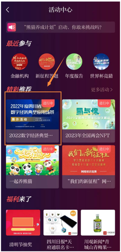 【第二步】在川观新闻首页,“我的”版块,点击“活动中心”,找到“2022年度四川省数字经济典型应用场景”展示投票活动的图片,点击参与活动。